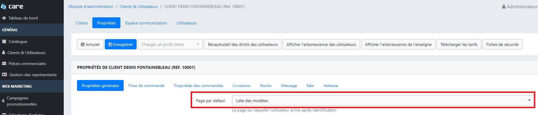 - Dans les propriétés générales, cliquez sur Page par Défaut (première ligne)