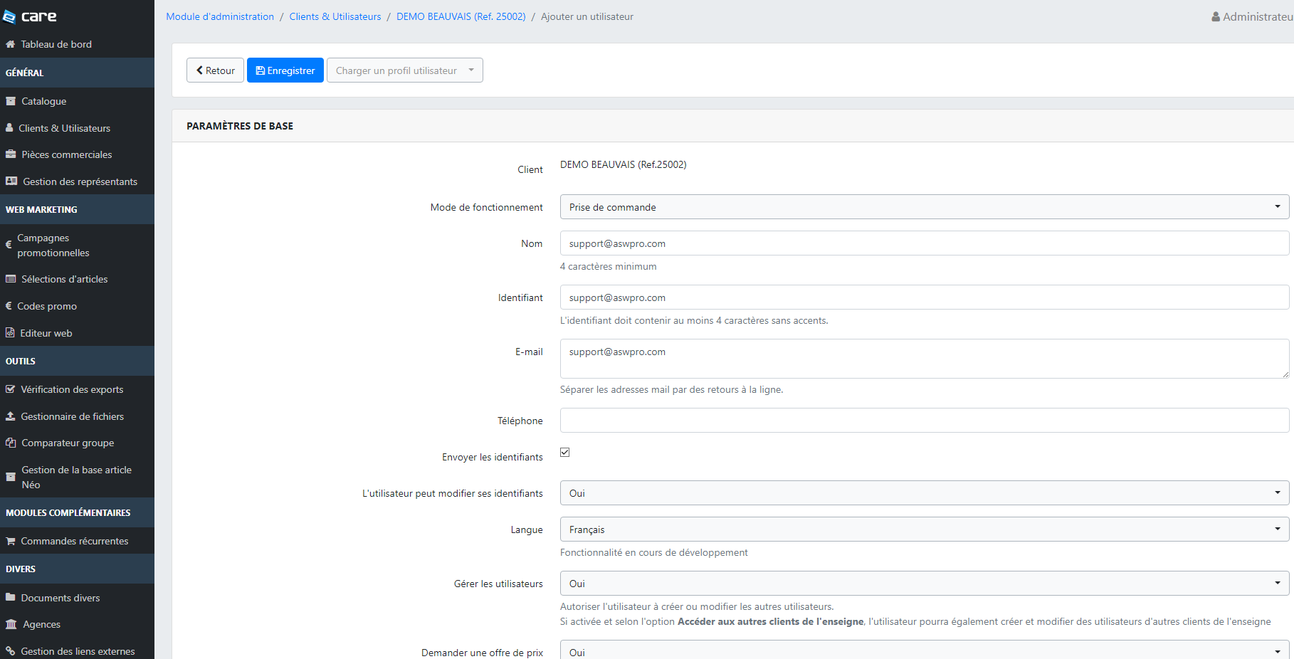A noter : Si vous n'avez pas envoyé les identifiants par défaut, mettez votre souris sur l'utilisateur crée (menu Clients et utilisateurs), survolez le à la souris et cliquez sur modifier. Cochez "Envoyer les identifiant", et cliquez sur enregistrer en haut à gauche de l'écran. |