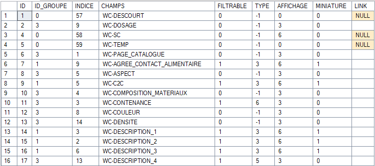 | AFFICHAGE | tinyint | Affichage du champ complémentaire dans la fiche produit | |||